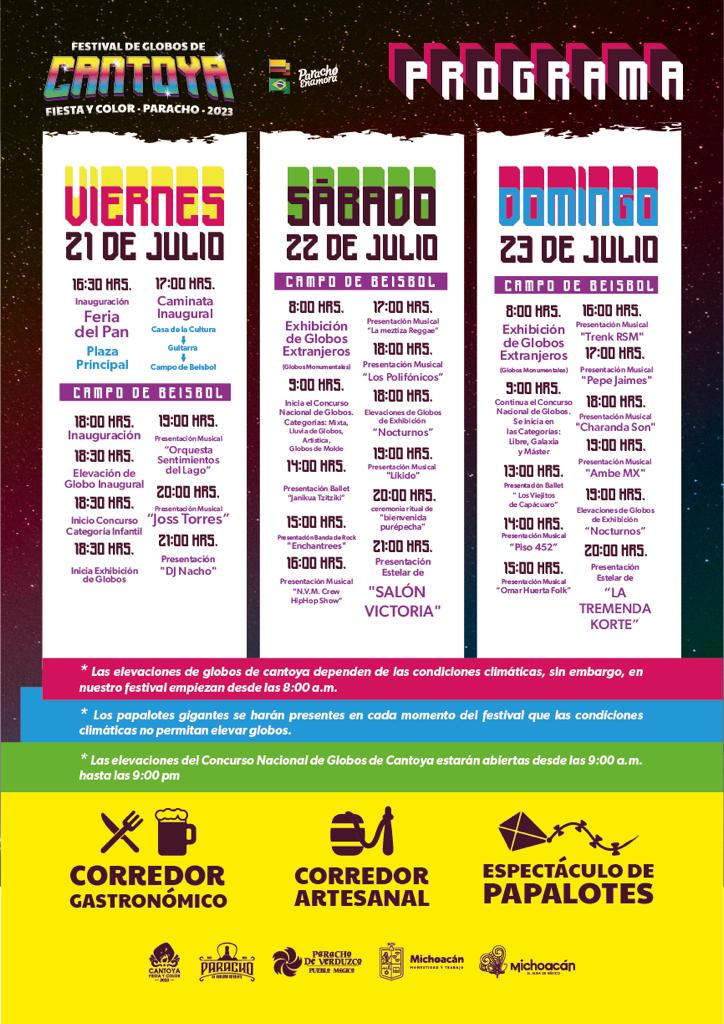 En Paracho se llevará a cabo del viernes 21 al domingo 23 de julio, con su festival denominado “Cantoya Fiesta y Color 2023”, en el que, como cada año estarán presentes con sus obras maestras, expertos globeros procedentes de Brasil y Colombia, tales como los equipos Inicio Magnífico y Unidos do 7.