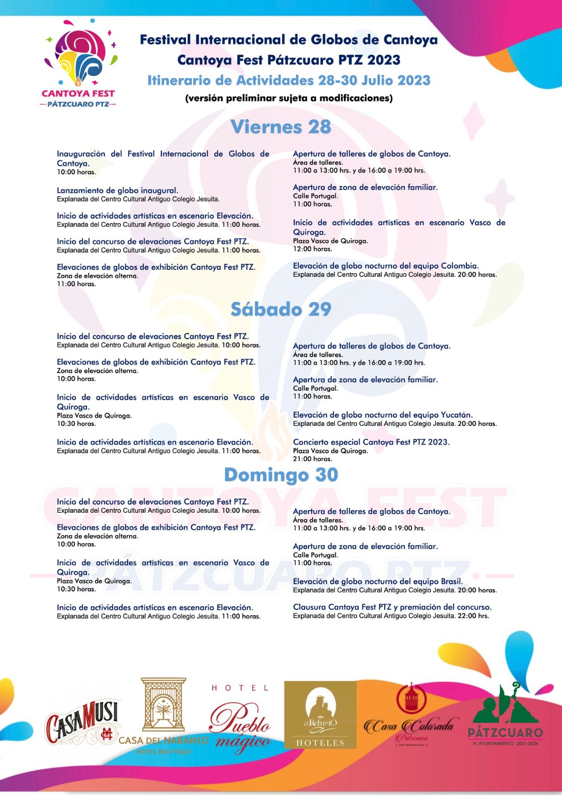 El siguiente fin de semana, del viernes 28 al domingo 30 de julio, el Pueblo Mágico de Pátzcuaro realizará su “Cantoya Fest 2023”, con lanzamientos a partir de las 11:00 horas desde la explanada del Centro Cultural Antiguo Colegio Jesuita.