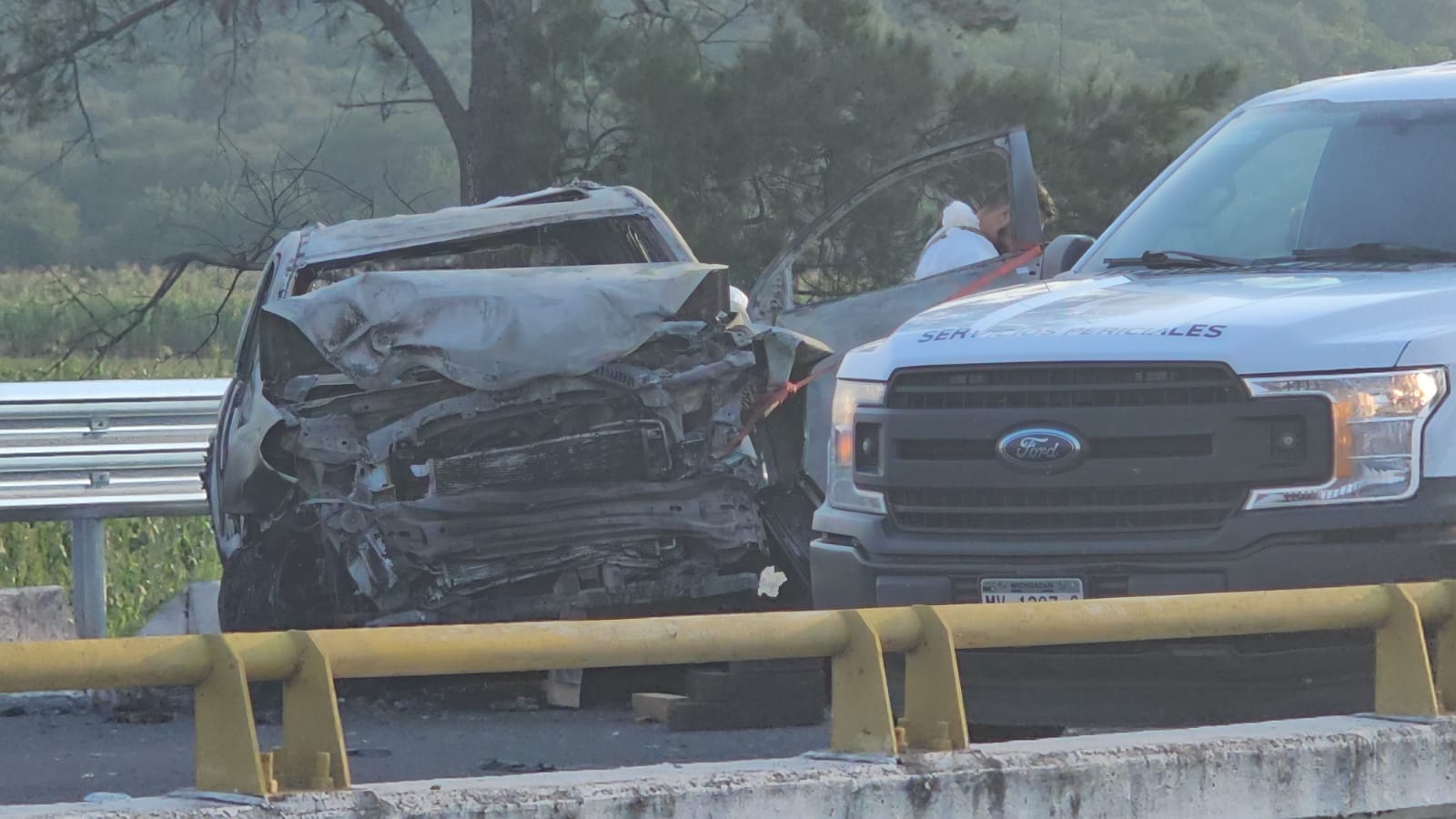 Se apreció que uno de los automotores involucrados es de la marca Volkswagen; una segunda unidad ardió en llamas y sus dos ocupantes quedaron calcinados. El tercer vehículo es de la compañía contratista.