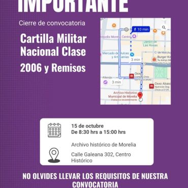 El trámite se puede realizar en el Archivo Histórico Este martes es el último día para tramitar la Cartilla Militar para los jóvenes Clase 2006 y Remisos; los interesados deben acudir a las oficinas del Archivo Histórico, ubicadas en la calle Galeana #302, en el Centro Histórico, de 08:15 a 15:00 horas. Los requisitos para obtener este documento oficial, son: 1.- Acta de Nacimiento (Original y copia) 2.- Clave Única […]