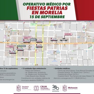 Para brindar atención médica a los asistentes a la ceremonia del Grito de Independencia y al desfile cívico militar Morelia, Michoacán.- La Secretaría de Salud de Michoacán (SSM), a través del Centro Regulador de Urgencias Médicas (CRUM), ha dispuesto un operativo especial para brindar atención médica a los asistentes de los festejos por el 214 aniversario de la Independencia de México y al desfile cívico militar en el Centro Histórico […]