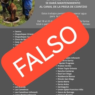 La información verídica se encuentra en cuentas oficiales del OOAPAS Morelia en Facebook, y @ooapasmorelia en Twitter El Organismo Operador de Agua Potable, Alcantarillado y Saneamiento de Morelia (OOAPAS), informa que circula en redes sociales un cartel de hace 4 años con un aviso de suspensión de agua en la ciudad, con lista de colonias, el cual está generando confusión entre la ciudadanía. Por lo anterior, se pide a la […]