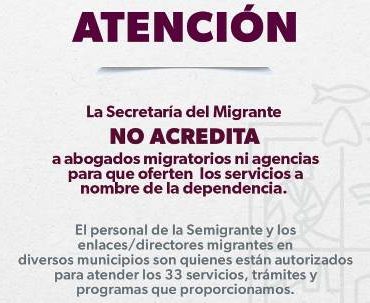 La Secretaría del Migrante (Semigrante) procederá legalmente ante quienes utilicen el nombre de la dependencia para lucrar con la gente, dejó en claro la titular María Teresa Mora Covarrubias, al precisar que no se ha acreditado a ningún abogado migratorio ni agentes para ofertar servicios a su nombre. Indicó que, a través de redes sociales, han llegado quejas por parte de ciudadanos que realizan diversos trámites con agentes particulares, quienes […]