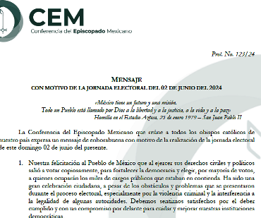 “Dios nos conceda sabiduría, serenidad y fortaleza para aceptar los resultados, y para trabajar unidos”, ora la Conferencia del Episcopado Mexicano La Conferencia del Episcopado Mexicano (CEM), que reúne a todos los obispos católicos de México, ha felicitado Institucionalmente y con respeto a Claudia Sheinbaum Pardo, por su triunfo en las urnas, que la convierte en virtual presidenta electa de los Estados Unidos Mexicanos para el periodo 2024-2030. Y han […]