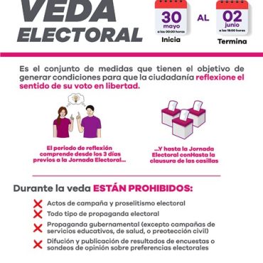 Con la finalidad de generar condiciones para que los ciudadanos se tomen el tiempo de reflexionar sobre el voto que ejercerán en libertad el próximo 2 de junio la normativa electoral señala una serie de medidas denominadas “Veda Electoral”. La veda inicia a partir de los tres días previos a la jornada electoral, es decir, inicia el 30 de mayo, este lapso está destinado a permitir que los electores reflexionen […]