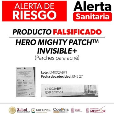 Se detectó la venta irregular del producto Hero MIGHTY PATCH™️ Invisible+ La Comisión Federal para la Protección contra Riesgos Sanitarios (Cofepris), a través de la Secretaría de Salud de Michoacán (SSM), informa a la población sobre la alerta sanitaria por la comercialización ilegal del producto Hero MIGHTY PATCH™️ Invisible+ (Parches para acné), en su presentación de 39 parches en caja de cartón, el cual no cumple con la normatividad sanitaria […]