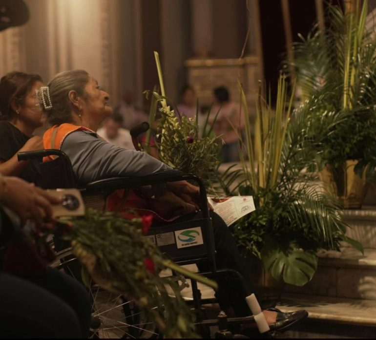 Desde el pasado viernes, Magdalena Jiménez, proveniente de la comunidad de Arantepacua, se encuentra a las afueras del templo de «San Francisco» en Uruapan, ofreciendo sus palmas, siendo una tradición que heredó de muchos años.