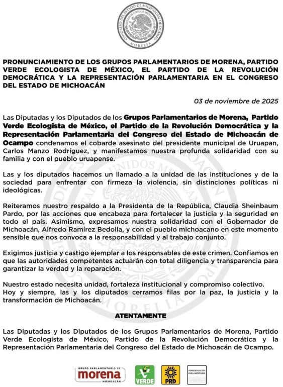 “Las diputadas y los diputados de los grupos parlamentarios de Morena, PVEM, PRD y la Representación Parlamentaria del Congreso de Michoacán condenamos el cobarde asesinato del presidente municipal de Uruapan, Carlos Manzo Rodríguez, y manifestamos nuestra profunda solidaridad con su familia y con el pueblo uruapense.”